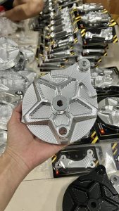 | Tên sản phẩm | : | Má đùm Exciter 2010 / Sirius / Jupiter mẫu ngôi sao 5 cánh nhôm cnc màu anode kèm khâu inox |